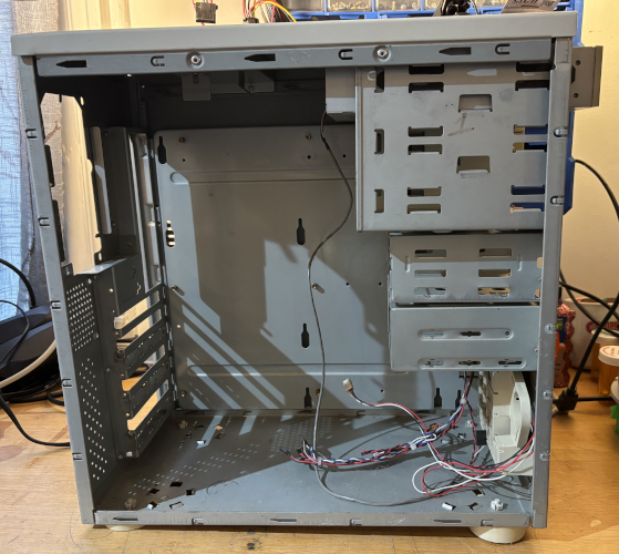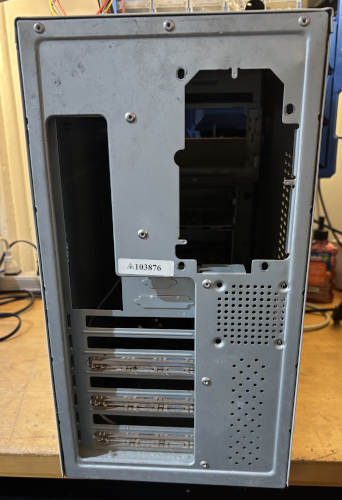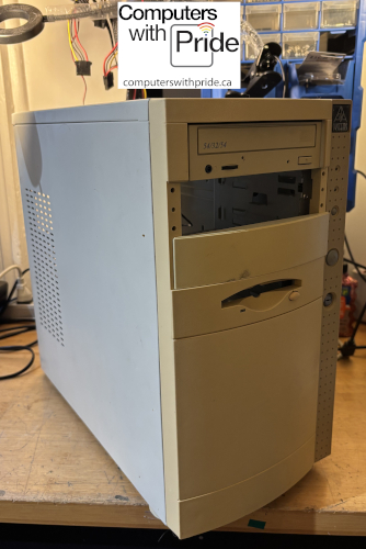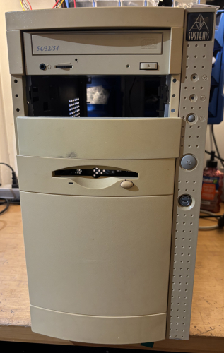 The case is in great condition. There is a CD-ROM optical drive installed. The front is a bit yellowed and is missing a 5 1/4" slot cover. See below for details.