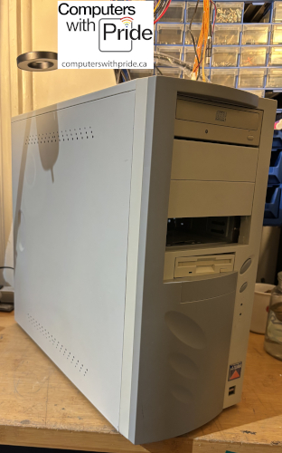 The case is in great condition. It comes with a power supply, CD-ROM optical drive and a floppy drive. The power supply has been tested and confirmed working. It is missing a 5.25" bay cover. See below for details.