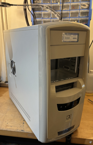 The case is in like condition. It comes with an 80mm side case fan installed. There are 2 x front USB ports. There is a Windows XP Home Edition activation sticker on the front. It is missing 2 x 5.25" drive bay covers and a 3.5" bay cover. See below for details.