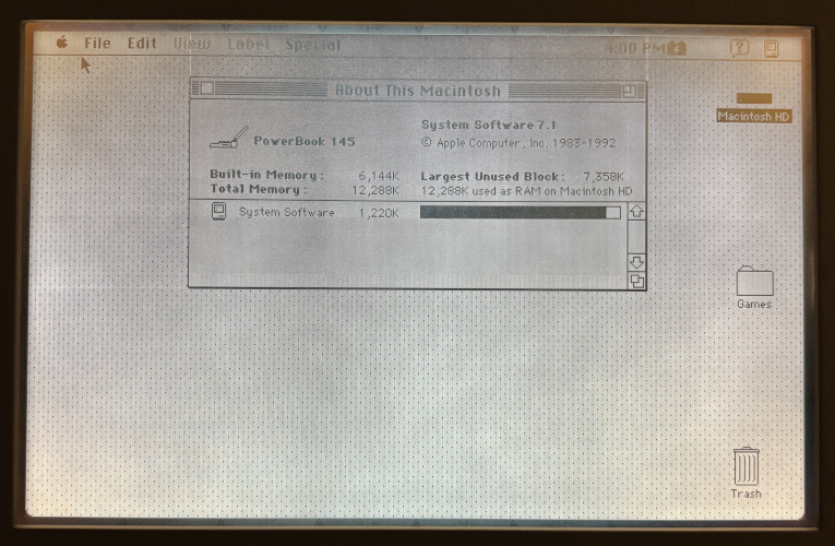 The laptop is in excellent condition. The laptop has been tested and confirmed working. There are no issues with the screen. It comes with the Apple power supply. Unsure if the battery holds a charge. There is a clean install of System 7.1. Please see below for the information of the laptop.