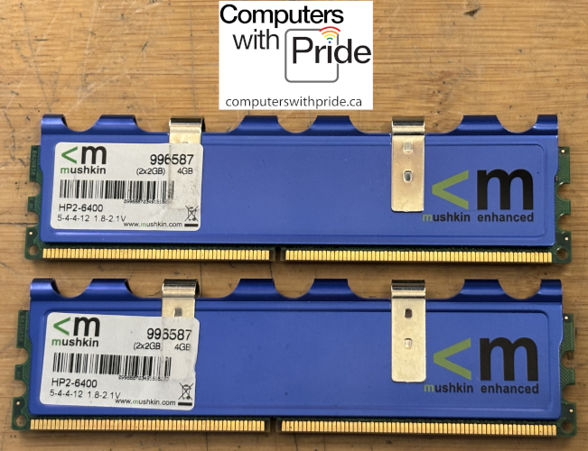They sticks of memory is in like new condition. They both have been tested and is confirmed to be in working condition. The sticks of memory are mushkin DDR2 EM2-6400 996587. They are 2GB each for a total of 4GB.