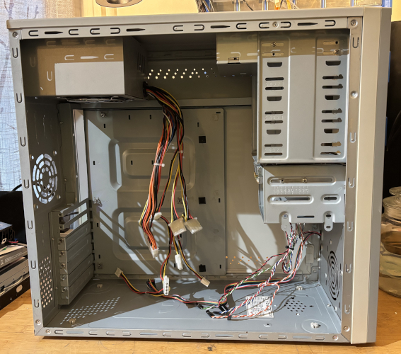 The case is in great condition. It comes with a power supply, CD-ROM optical drive and a floppy drive. The power supply has been tested and confirmed working. It is missing a 5.25" bay cover. See below for details.