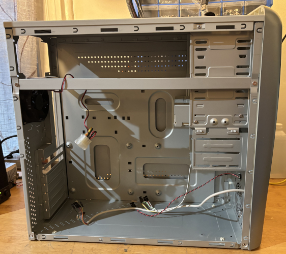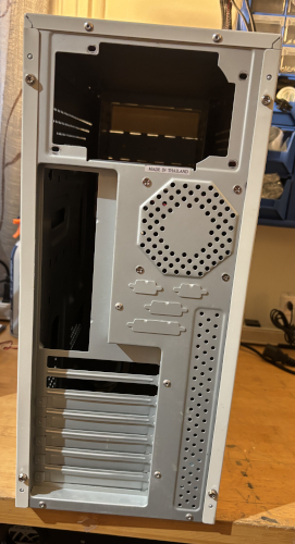 The case is in like new condition. There is a rear 80mm case can and a CD RW 52x32x52x optical drive installed. There is a slow on the front for a 3.5" floppy drive. It has 2 x front USB ports. See below for details.