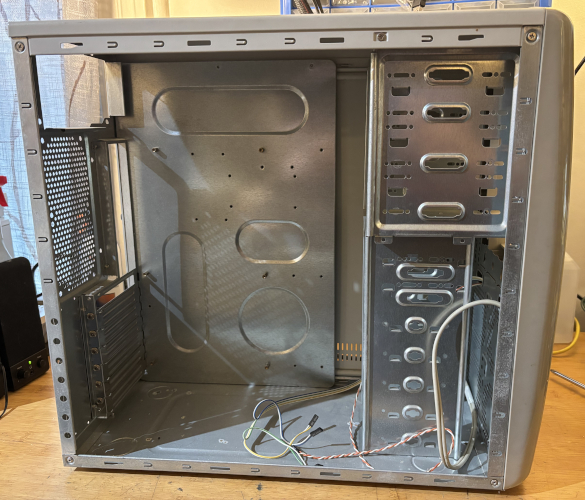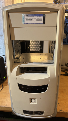 The case is in like condition. It comes with an 80mm side case fan installed. There are 2 x front USB ports. There is a Windows XP Home Edition activation sticker on the front. It is missing 2 x 5.25" drive bay covers and a 3.5" bay cover. See below for details.
