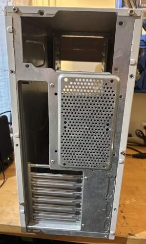 The case is in like condition. It comes with an 80mm side case fan installed. There are 2 x front USB ports. There is a Windows XP Home Edition activation sticker on the front. It is missing 2 x 5.25" drive bay covers and a 3.5" bay cover. See below for details.