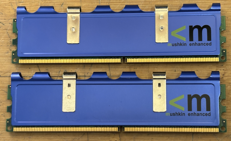 They sticks of memory is in like new condition. They both have been tested and is confirmed to be in working condition. The sticks of memory are mushkin DDR2 EM2-6400 996587. They are 2GB each for a total of 4GB.